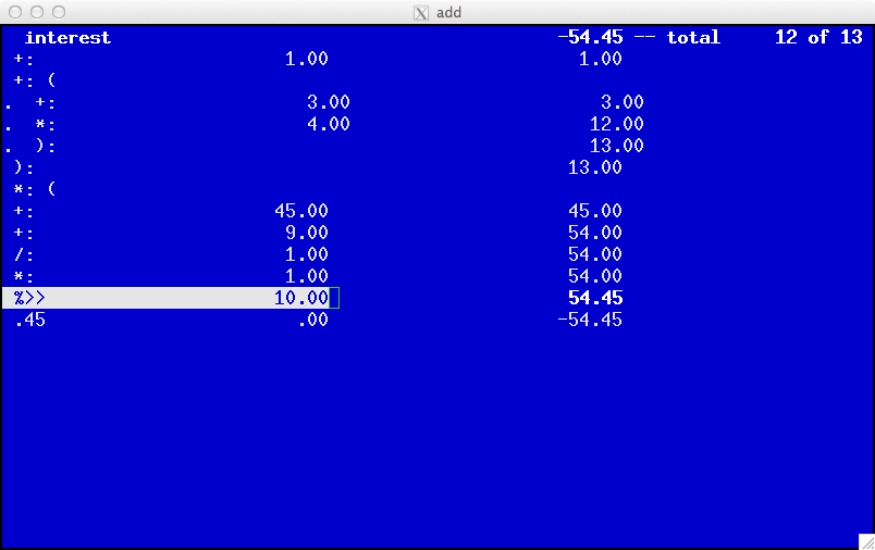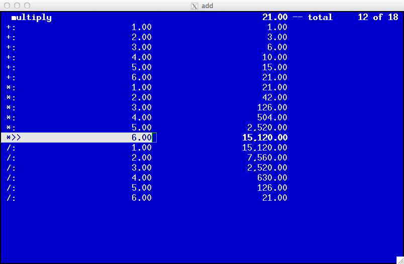 add maintains a running result for each operation. You may scroll to any position in the expression list and modify the list. Enter data by typing numbers (with optional decimal point), separated by operators.