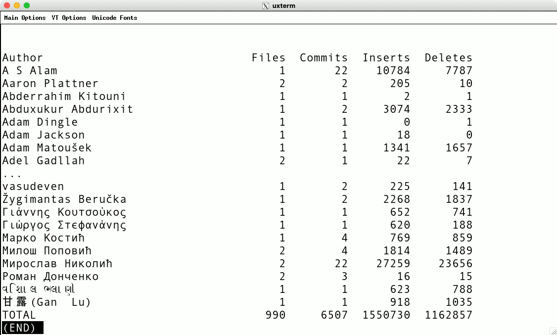 Author Files Commits Inserts Deletes A S Alam 1 22 10784 7787 Aaron Plattner 2 2 205 10 Abderrahim Kitouni 1 1 2 1 Abduxukur Abdurixit 1 2 3074 2333 Adam Dingle 1 1 0 1 Adam Jackson 1 1 18 0 Adam Matoušek 1 1 1341 1657 Adel Gadllah 2 1 22 7 ... vasudeven 1 2 225 141 Žygimantas Beručka 1 2 2268 1837 Γιάννης Κουτσούκος 1 1 652 741 Γιώργος Στεφανάνης 1 1 620 188 Марко Костић 1 4 769 859 Милош Поповић 2 4 1814 1489 Мирослав Николић 2 22 27259 23656 Роман Донченко 2 3 16 15 િિશાલ ભલાણી 1 1 623 788 甘露(Gan Lu) 1 1 918 1035 TOTAL 990 6507 1550730 1162857Your browser probably does not render this properly (expect problems with fixed-pitch Unicode), but it displays correctly in xterm: