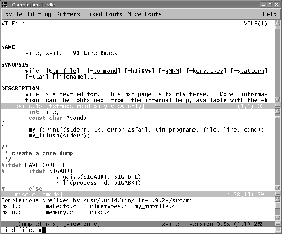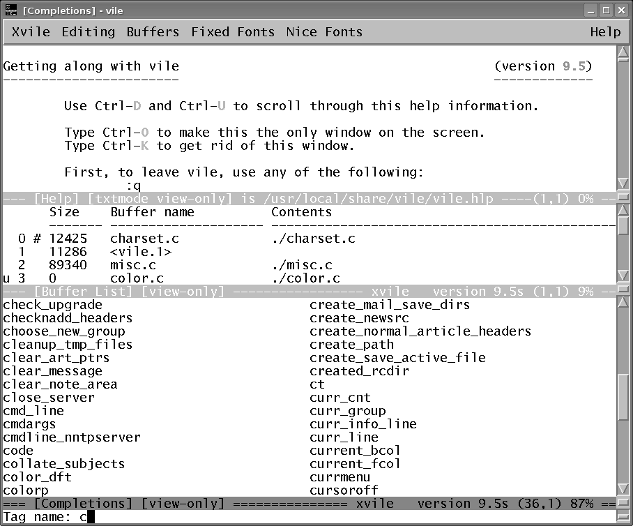 | [5] | The [Completions] buffer is automatically sized, showing no more lines than necessary. If it is too large for available space, vile borrows up to ¾ of the space from an adjacent pane. |