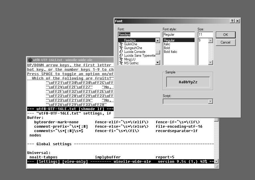 Figure 12.5 shows the result of selecting a more capable font. If you select the system font again, winvile will show the hexadecimal values again. If you prefer to see the wide characters as hexadecimal all the time, vile has an option setting for this purpose.